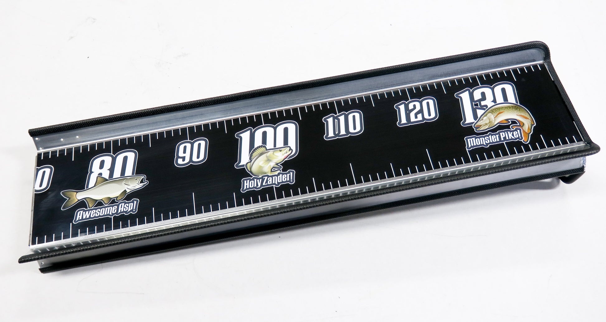 The measuring scale is accurate to the millimeter, and the illustrations of the most common predatory fish at the key length markings perfectly complement the design.